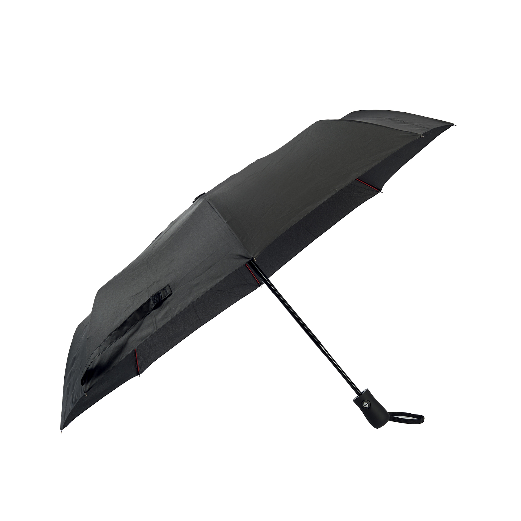 3 schwarzer faltbarer Taschenschirm aus Pongé-Gewebe mit gummibeschichtetem Kunststoffgriff und Auf/Zu-Automatik. Dekorative rote Innenrippen. Hülle mit weißem Logoaufdruck.