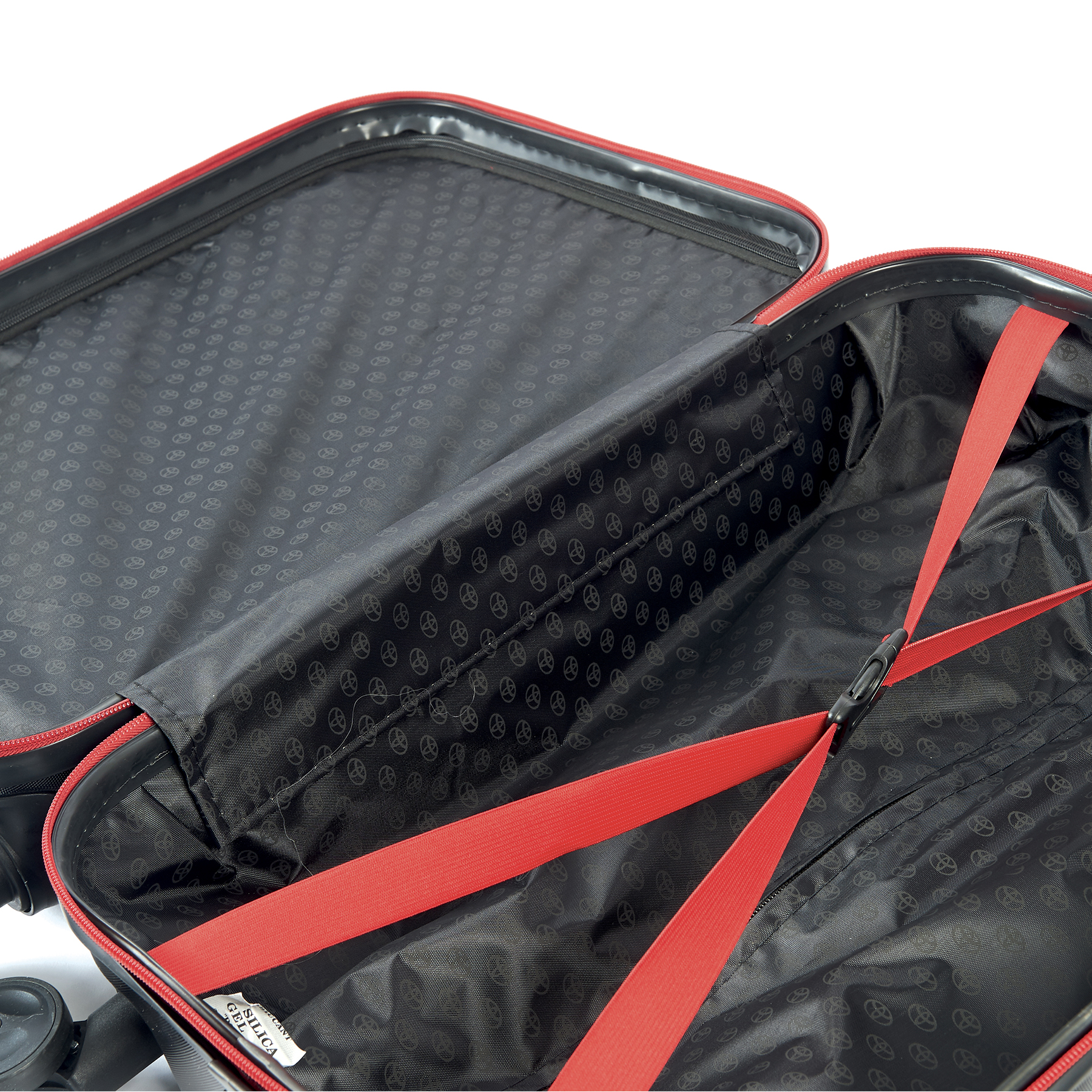 Jederzeit startklar mit diesem Hartschalen-Kabinentrolley mit 4 Rollen. Seitlich mit TSA-Schloss und oben mit Teleskop-Gepäckgriff versehen. Schlichte schwarze Optik mit rotem Rundum-Reißverschluss. Innenfutter Ton-in-Ton mit Logodruck gemustert.