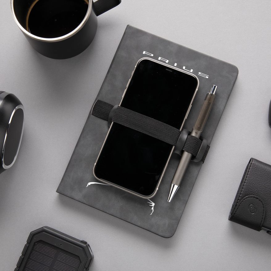 Elegantes A5-Notizbuch mit festem PU-Einband und 80 Blatt/160 Seiten auf liniertem¸ cremefarbenen 70 gm/s Papier – ideal für jedes Meeting. Das Notizbuch ist angenehm weich und hat auf der Vorderseite ein waagerechtes Elastikband mit Halterung für Handy und Stift.