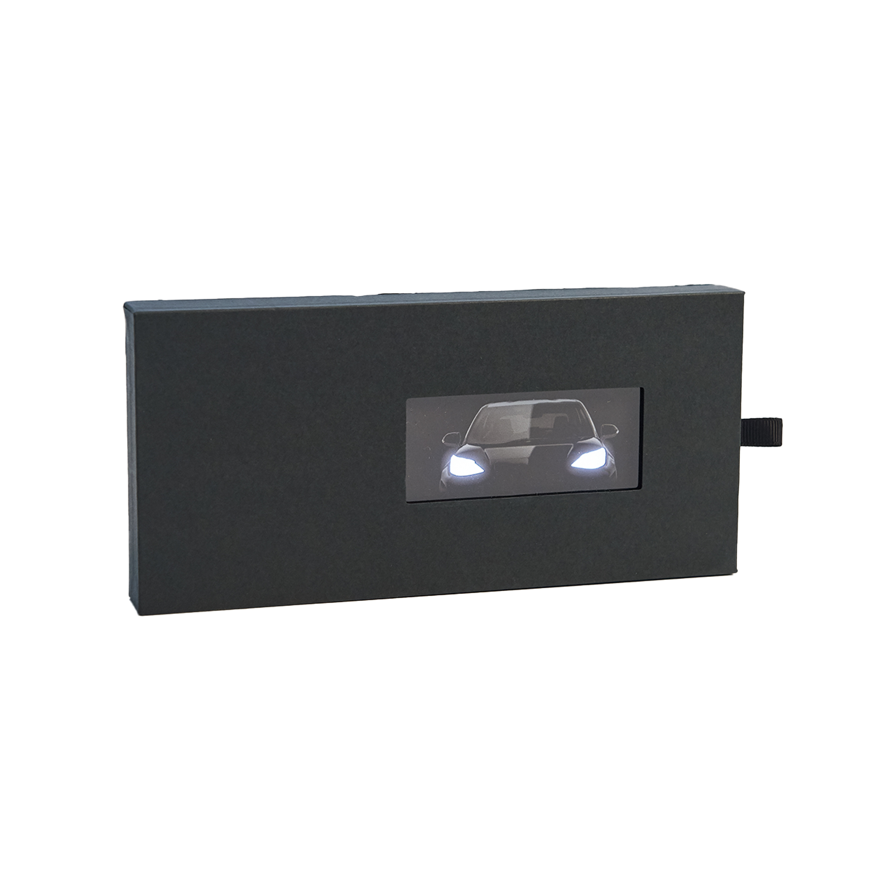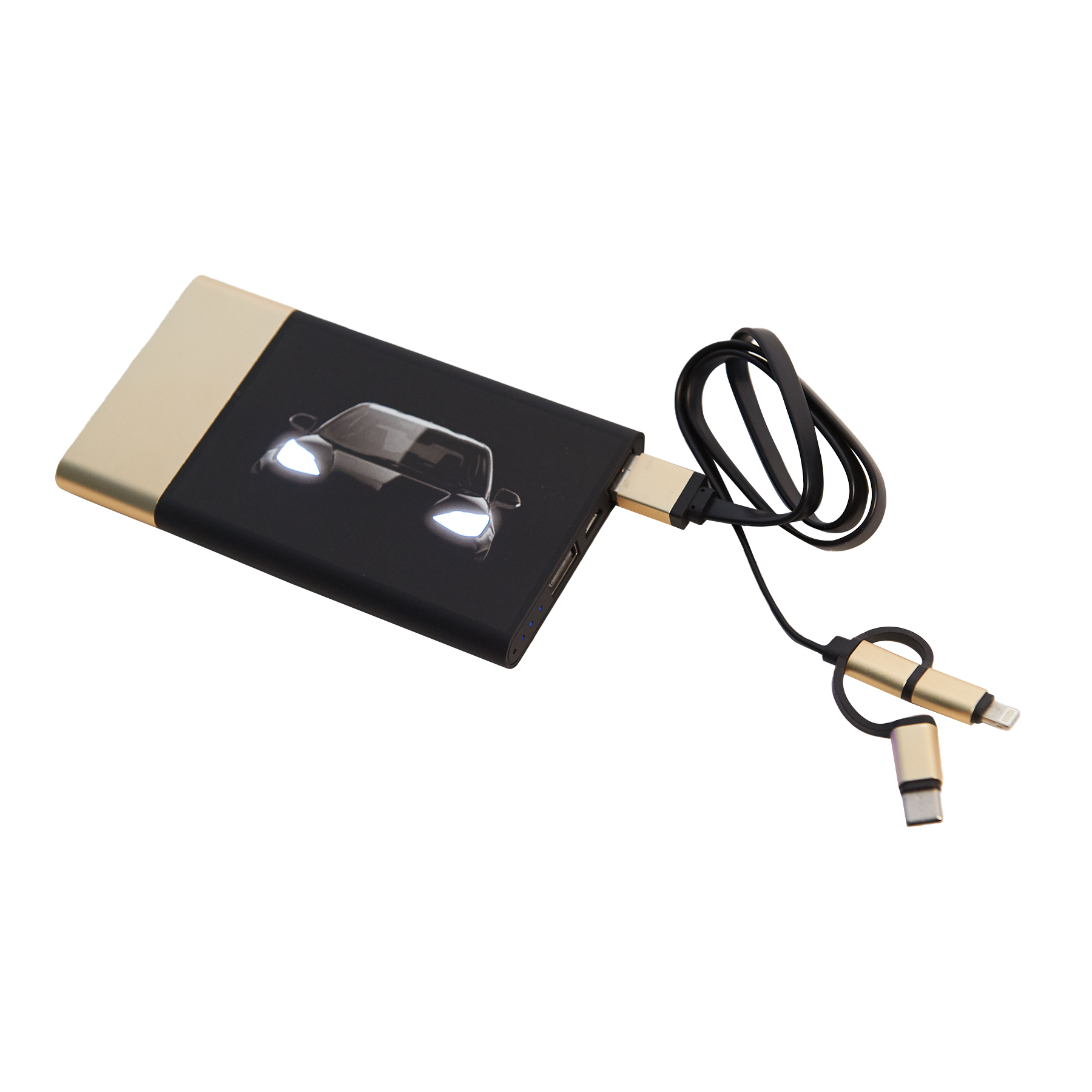 5000 mAH Powerbank mit Leuchtlogo 3-in-1-Schnellladekabel (Typ C Android iPhone) farblich abgestimmt auf die Powerbank. Durch die „Shake-Funktion“ leuchtet das Gerät bei Berührung auf und das Logo kann bis zu 20 Tage lang leuchten ohne dass der Akku aufgeladen werden muss. DC-Eingang: 5V/2A Micro-USB. DC Dual-Ausgang: 5V/2.1A und 5V/1A Schnellladung. Größe: 127 x 70 x 12 mm. Wird mit einer Geschenkbox aus Recyclingpapier geliefert.