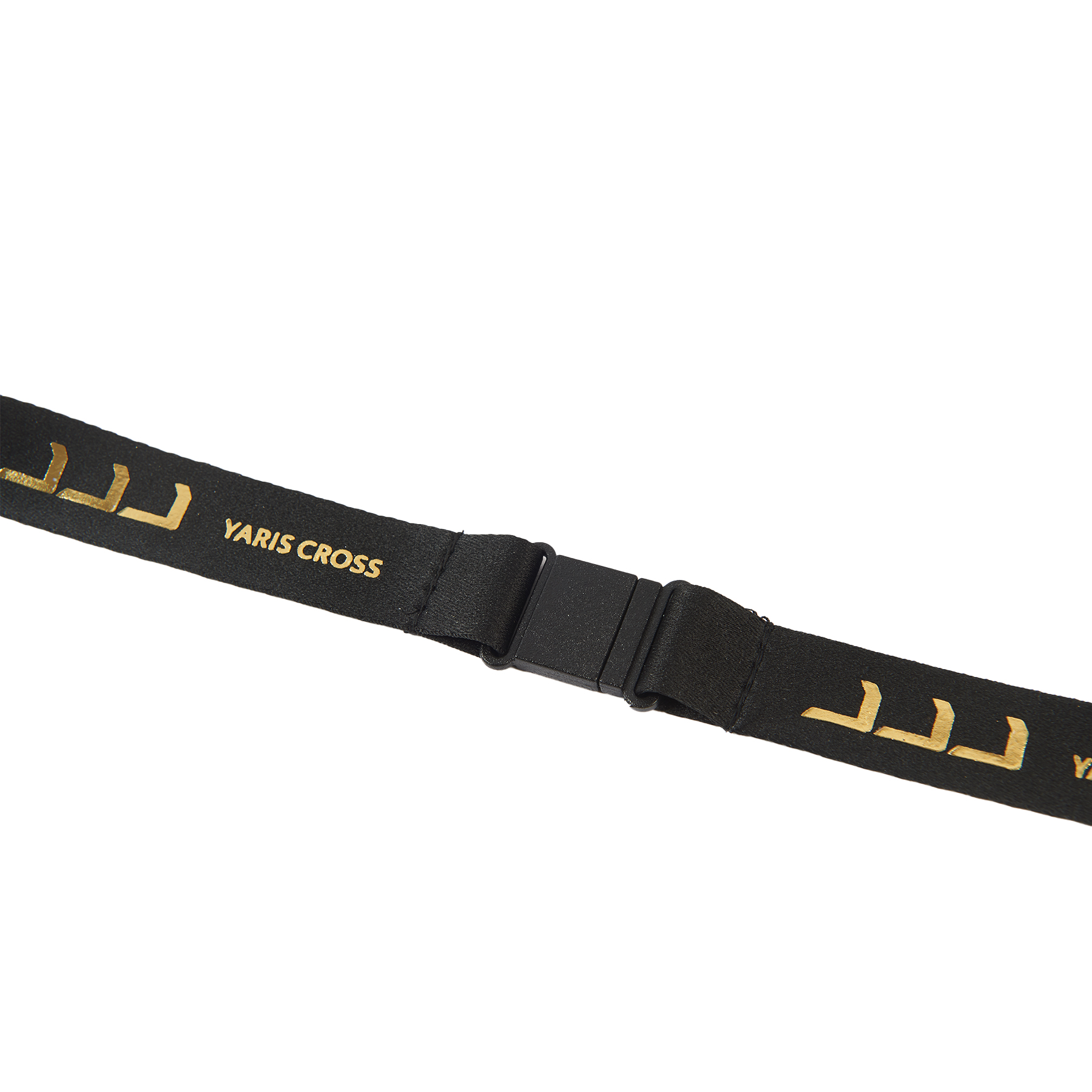 Schwarzes Schlüsselband mit auf 1 Seite rundherum gestanztem Logo aus Metallfolie. Hergestellt aus feinem Polyester mit Metallhaken und schwarzem Sicherheitsverschluss. Größe 90x2 cm.