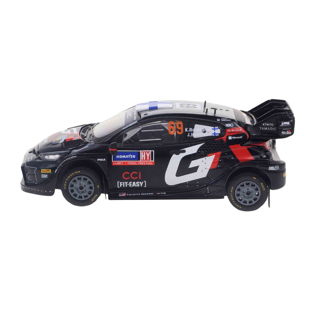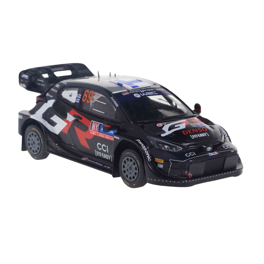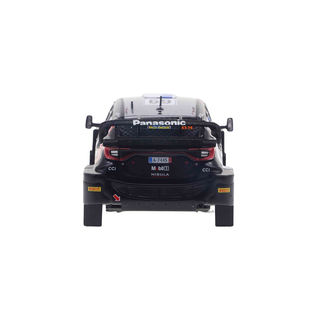 Ein Replika-Modell im Maßstab 1:43 von Kalle Rovanperas TOYOTA YARIS WRC Nr. 69 Rallyefahrzeug bei der schwedischen WRC Rallye 2024.