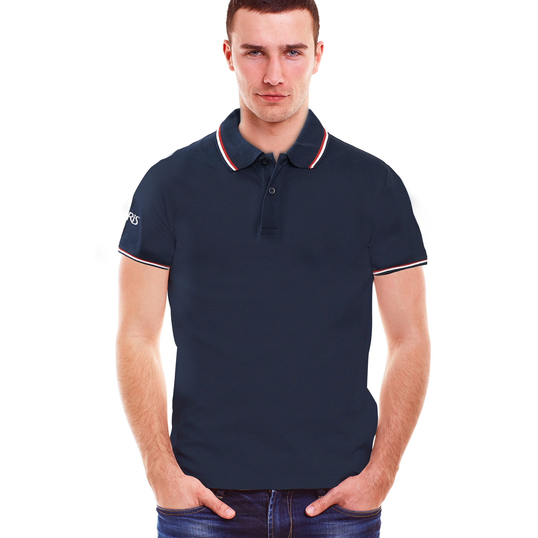 Elegantes Herren-Poloshirt 100 % Baumwolle marineblau mit roten und weißen Streifen an Kragen und beiden Ärmeln.