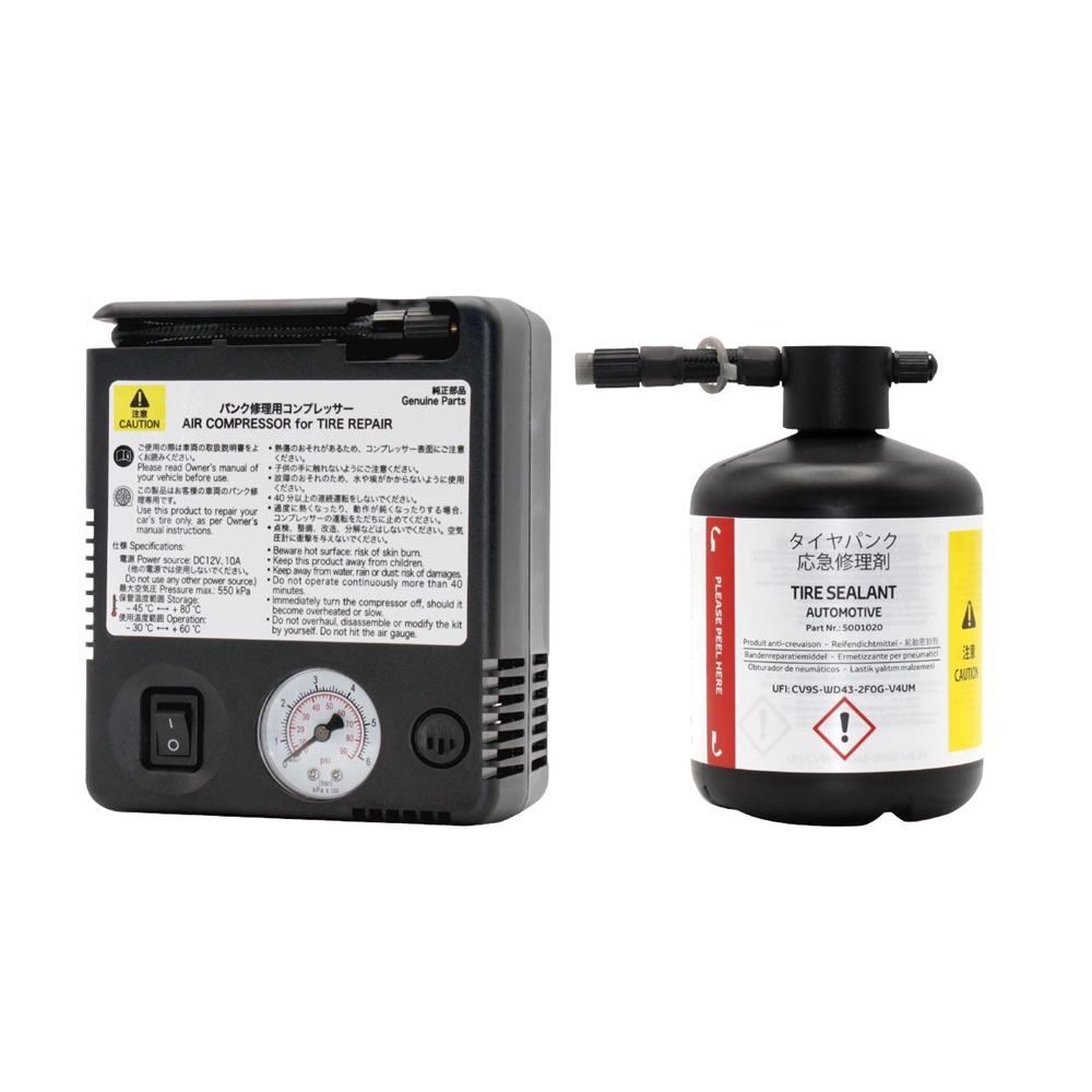 Ein Kompressor und eine Dichtungsflasche zur Reparatur Ihres Reifens im Falle einer Reifenpanne.Dichtmittel Verfallsdatum : Produktionsdatum des Dichtmittels + 6 Jahre