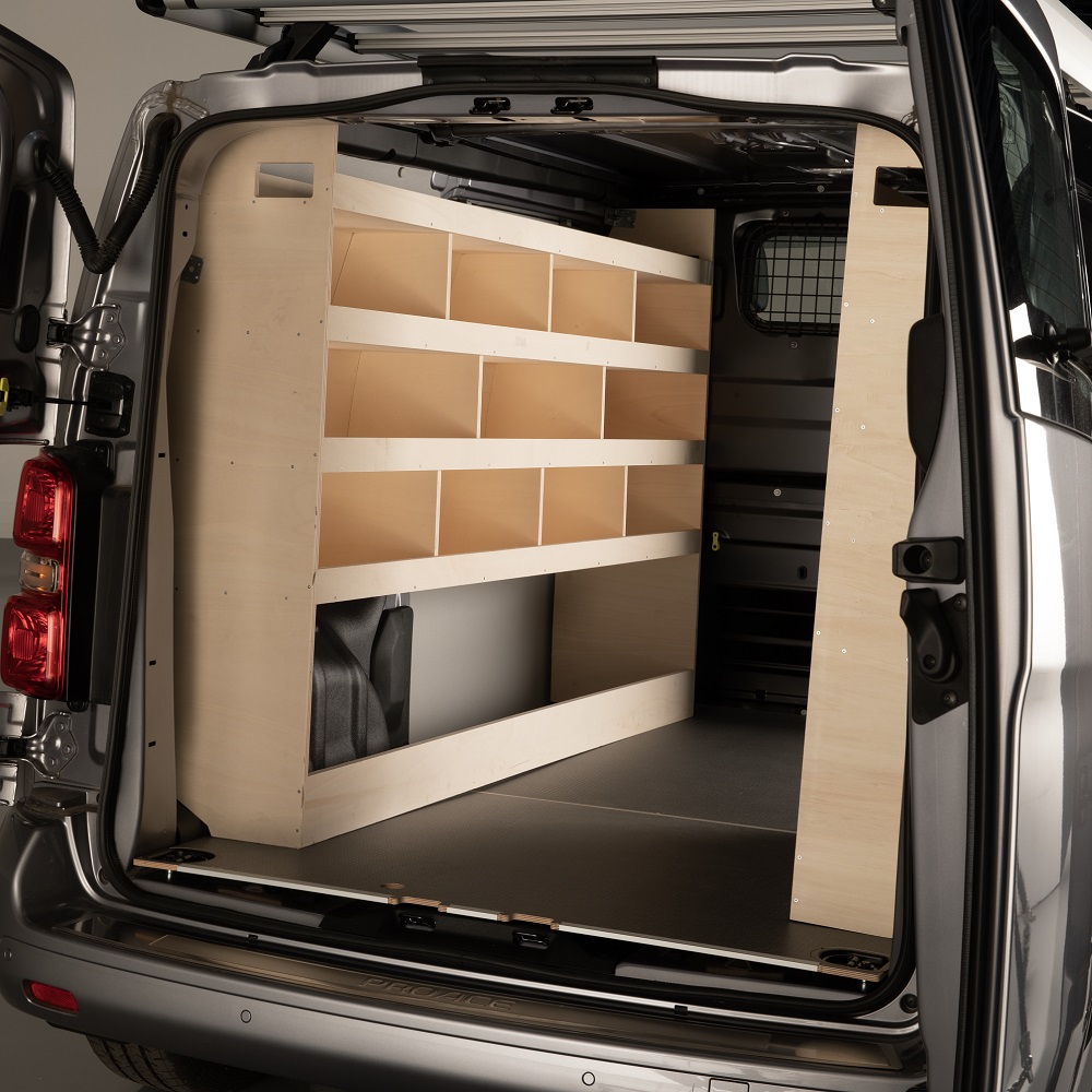 Das speziell für den Proace entworfene Holzregal besteht aus 4 Einlegeböden, 12 Fächern und einem oberen Regal in voller Länge. Das Holzregal ist aus 15 mm starkem, hochwertigem europäischem Sperrholz gefertigt und hat eine Tragfähigkeit von 100 kg.